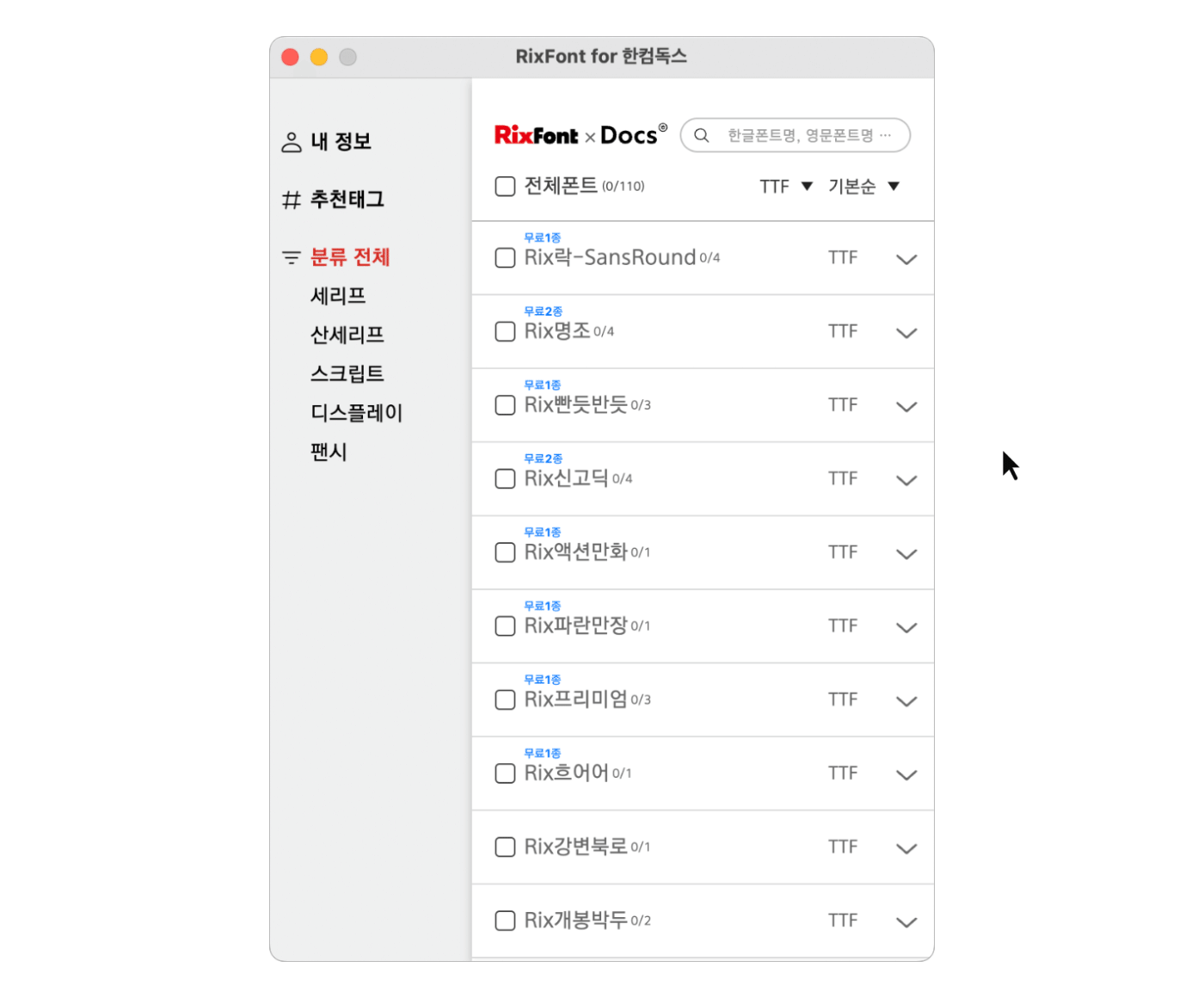 한컴독스만을 위한 RixFont를 경험하세요. 전문 디자이너가 선택한 RixFont,이제 한컴독스에서 프리미엄 폰트를 만나보세요. Windows용 Mac용 RixFont for 한컴독스는 PC앱 전용 (웹·모바일 미지원) 서비스입니다. 지원 환경 : Windows 10 64bit 이상 / MacOS 10.14.6 이상